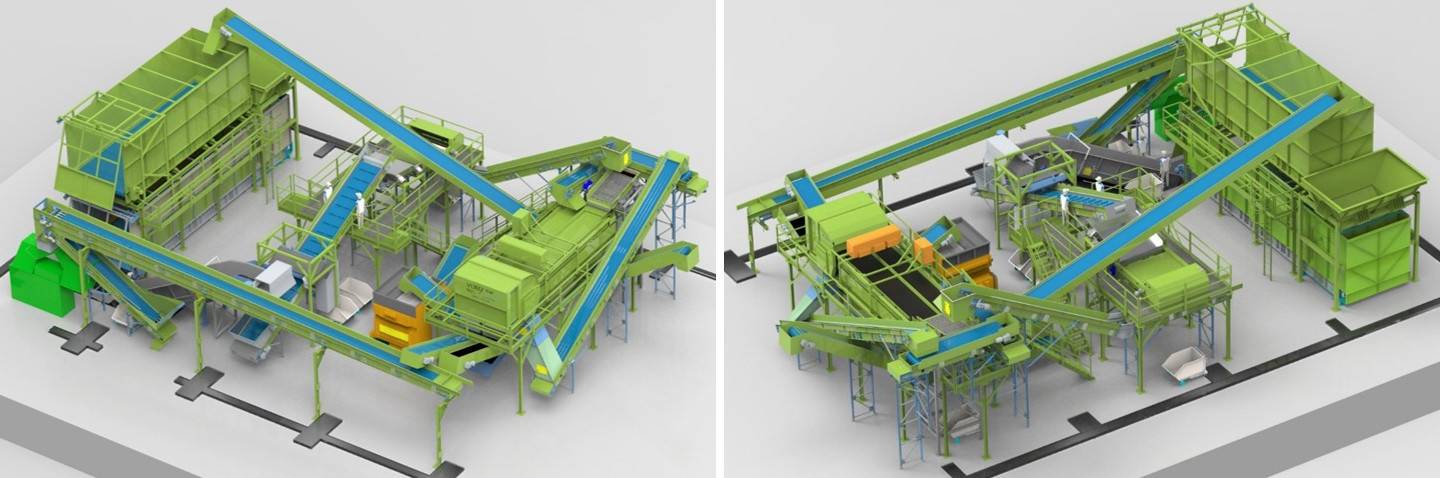 Automatyczna linia sortująca została zaprojektowana z myślą o wydajności 1500 kg/godzinę i służy do sortowania odpadów z "żółtych pojemników", czyli butelek PET, puszek aluminiowych i żelaznych.
