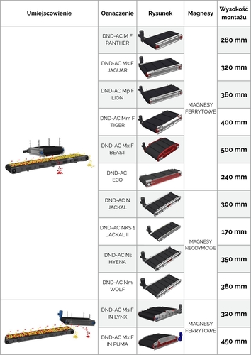 Dostępne są modele z magnesami ferrytowymi i bardzo silnymi magnesami neodymowymi, zarówno do montażu poprzecznego nad taśmą, jak i do montażu wzdłużnego nad miejscem przesypu (rolką końcową). Każda linia modelowa została zaprojektowana z uwzględnieniem specyficznych warunków eksploatacyjnych i wymaganej głębokości pola magnetycznego.